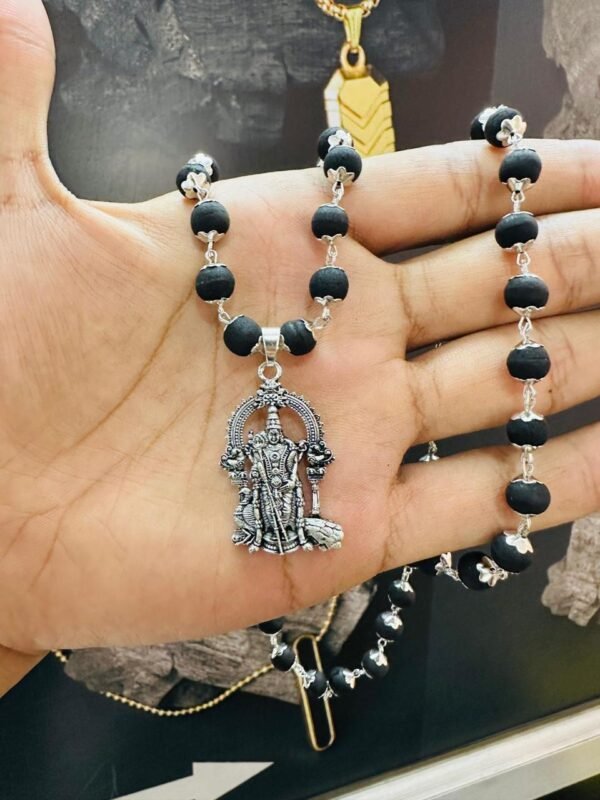 Be the first to review “8mm silver plated karungali maalai plus standing murugan dollar”